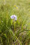 Spring Squill or Vernal Squill (Scilla verna) is a perennial which rarely grows much taller than 10 to 15cm. It produces blue, star-like, six-petalled flowers from March to August. This plant is in decline and in Britain is now mainly found on the western coasts. Usually having darker blue petals, this fairly pale one was photographed on Foula.