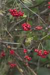 Goldcrest (Regulus regulus) at the Mire Loch, St Abb's, feeding amongst berries of Rowan or Mountain ash (Sorbus aucuparia). Thousands of European Goldcrests visit eastern Scotland in winter.