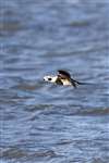 Male Long-tailed duck (Clangula hyemalis) in flight over the Ythan estuary, Newburgh, Aberdeenshire