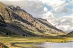 Glen Coe with Loch Achtriochtan in the forground. On the left is an alluvial fan caused by deposition by the stream gushing out of the gully. Scanned from a slide taken by CE Palmar