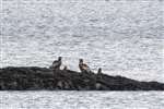 Four immature White tailed or Sea eagles (Haliaeetus albicilla) on a rock in the Sound of Mull.