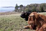 Two Highland bulls laze in a field in front of the Loch Melfort Hotel, with Arduaine Garden and the island of Luing in the background.
